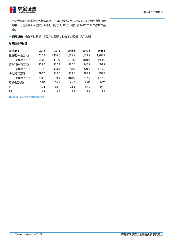 预测公司2016年至2018年每股收益分别为0.45元、0.60元和0.70元。考虑到血筛业务增长迅猛,出口产品通过WHO认证,海外销售有望持续好转,上调至买入-A建议,6个月目标价为25元,相当于2017年41.7倍的市盈率。