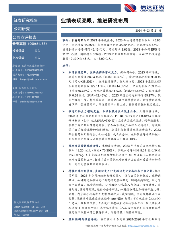 长春高新2023年业绩表现亮眼,生物类药品营收发力,带疱疫苗营销稳步开展,持续丰厚研发管线,多项研发并行发挥研发优势与技术平台优势。公司在儿科主力领域稳健发展的同时,积极拓展非生长激素业务,并持续加大研发投入,为未来发展奠定坚实基础。信达证券维持对公司“买入”评级,看好公司未来发展前景。