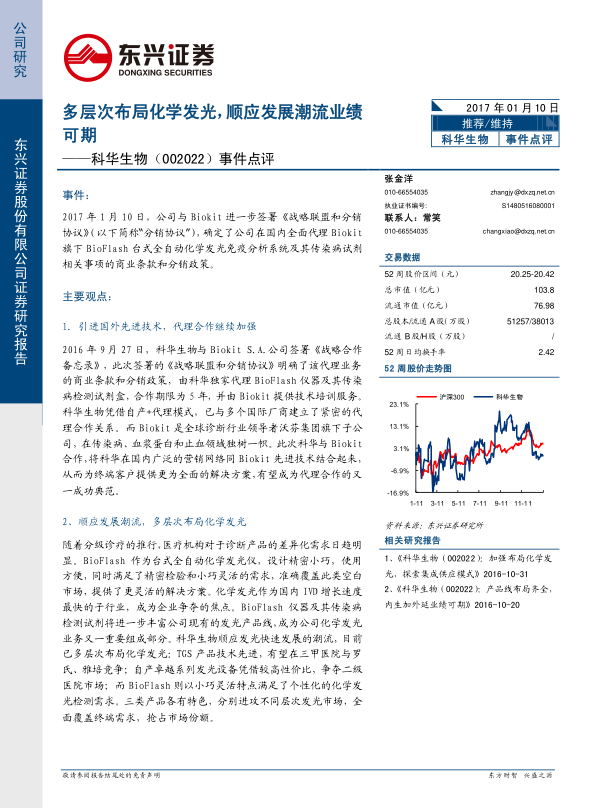 2017年1月10日,科华生物与Biokit进一步签署《战略联盟和分销协议》,确定了公司在国内全面代理Biokit旗下BioFlash台式全自动化学发光免疫分析系统及其传染病试剂相关事项的商业条款和分销政策。
