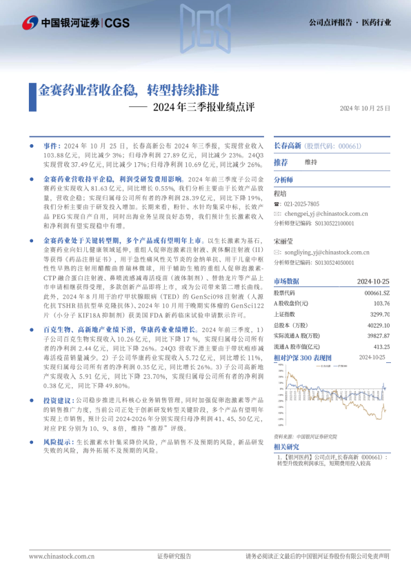 2024年三季报业绩点评:金赛药业营收企稳,转型持续推进