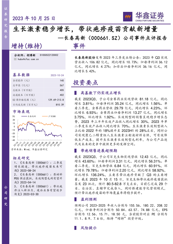 长春高新股份发布2023年三季度业绩公告:2023年Q3实现营业收入106.82亿元,同比增长10.73%;归母净利润36.12亿元,同比增长4.27%;扣非后归母净利润36.16亿元,同比增长5.42%。