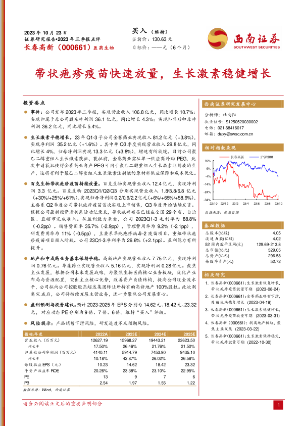 本报告对长春高新2023年三季报进行了全面分析,指出带状疱疹疫苗的快速放量和生长激素业务的稳健增长是公司业绩增长的主要驱动力。公司通过聚焦主业、剥离地产业务,有望进一步提升盈利能力。维持“买入”评级,但需关注潜在风险。