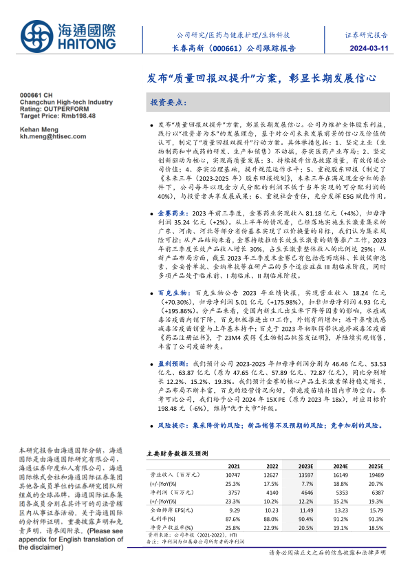 发布“质量回报双提升”方案,彰显长期发展信心。公司为维护全体股东利益,践行以“投资者为本”的发展理念,基于对公司未来发展前景的信心及价值的认可,制定了“质量回报双提升”行动方案。具体举措包括:1、坚定主业(生物制药和中成药的研发、生产和销售)不动摇,夯实医药产业布局;2、坚定创新驱动为核心,实现高质量发展;3、持续提升信息披露质量,有效传递公司价值;4、夯实治理基础,提升规范运作水平;5、重视股东回报(制定了《未来三年(2023-2025年)股东回报规划》,未来三年在满足现金分红的条件下,公司每年以现金方式分配的利润不低于当年实现的可分配利润的40%),与投资者共享发展成果;6、重视社会责任,充分发挥ESG赋能作用。