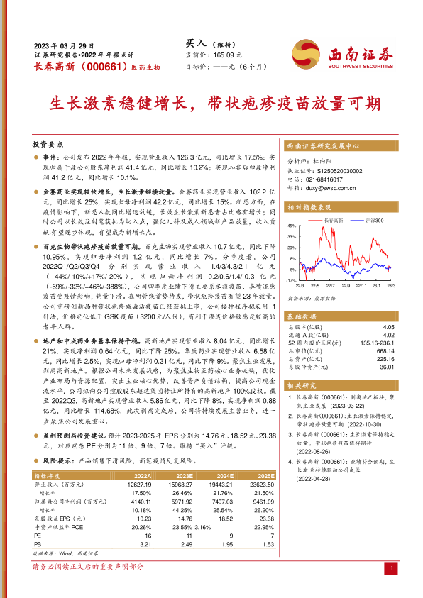 长春高新2022年年报显示公司整体业绩稳健增长,金赛药业的生长激素业务是主要增长引擎。百克生物的带状疱疹疫苗获批上市,有望成为新的业绩增长点。公司剥离高新地产,进一步聚焦生物医药核心业务。维持“买入”评级,但需关注产品销售下滑和疫情反复的风险。