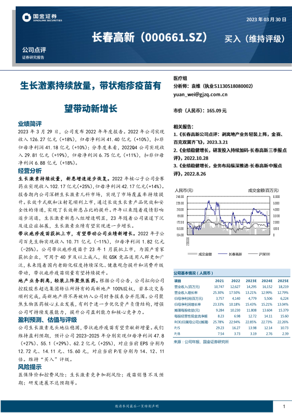 公司生长激素龙头地位稳固,带状疱疹疫苗有望贡献新增量。我们维持盈利预期,预计公司2023-2025年分别实现归母净利润47.8(+27%)、55.1(+29%)、62.2亿元(+25%),对应当前EPS分别为12.72元、14.11元、15.60元,对应当前P/E分别为14、12、11倍。维持“买入”评级。