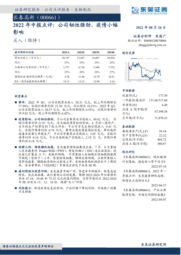 盈利预测与投资评级: 生长激素市场广阔,渗透率不断提升,新患高速增长, 适应症拓展,我们看好公司的发展, 维持 2022-2024 年归母净利润为 47.18、 59.48 和 75.32 亿元的盈利预测, 当前市值对应 2022-2024年 PE 分别为 15、 12、 10 倍,维持“买入”评级。