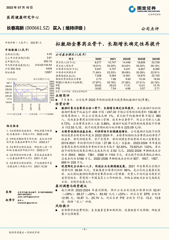 本报告分析了长春高新的股权激励计划,认为该计划能够深度绑定金赛药业核心骨干,提升公司长期增长的确定性。同时,公司设定的业绩考核目标稳健高增长,彰显了对未来发展的信心。维持公司 2022-2024 年盈利预测不变,维持“买入”评级,但需注意医保政策、市场竞争、产品销售和研发进展等风险。