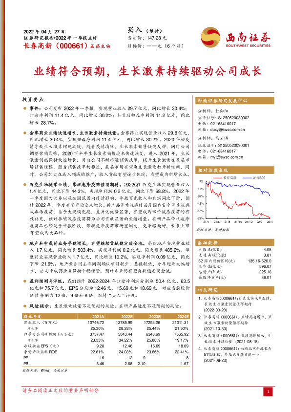 本报告对长春高新2022年一季报进行了全面分析,认为公司业绩增长主要受益于金赛药业和生长激素业务的驱动。虽然百克生物一季度业绩受到疫情影响,但新产品和在研产品具有增长潜力。地产和中成药业务保持稳定。维持“买入”评级,但需关注相关风险。