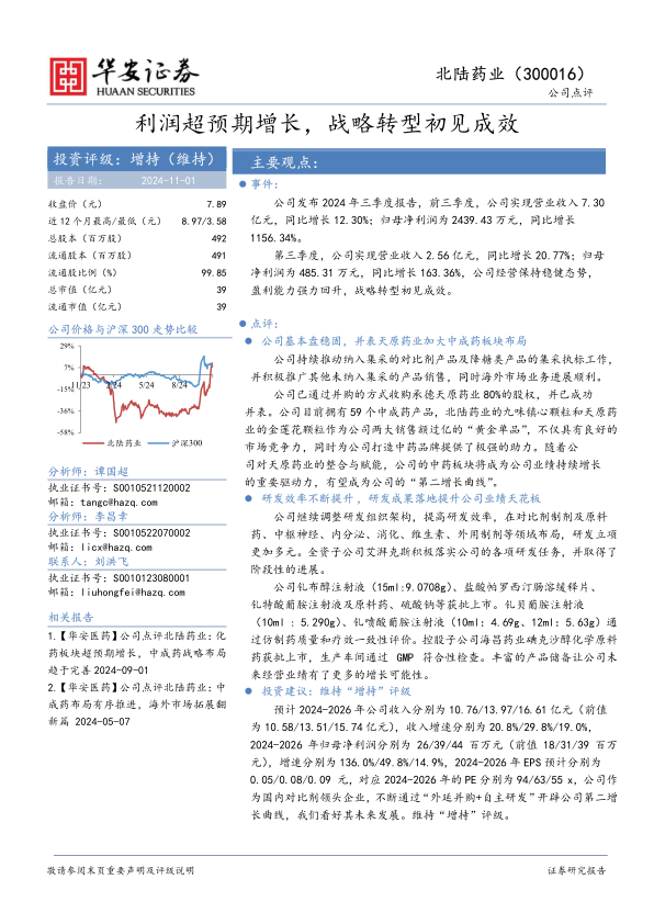 北陆药业2024年前三季度业绩表现亮眼,归母净利润实现超预期增长,显示出公司经营的强劲复苏和战略转型的初步成功。公司在稳固对比剂等核心业务的同时,通过并购天原药业积极布局中成药板块,并将其打造为新的业绩增长点。此外,公司持续加大研发投入,提升研发效率,并有多款产品获批上市或通过一致性评价,为未来业绩增长提供了坚实的产品储备。尽管面临集采、研发和并购整合等风险,但分析师基于公司“外延并购+自主研发”的双轮驱动战略,维持“增持”评级,看好其未来的发展潜力。