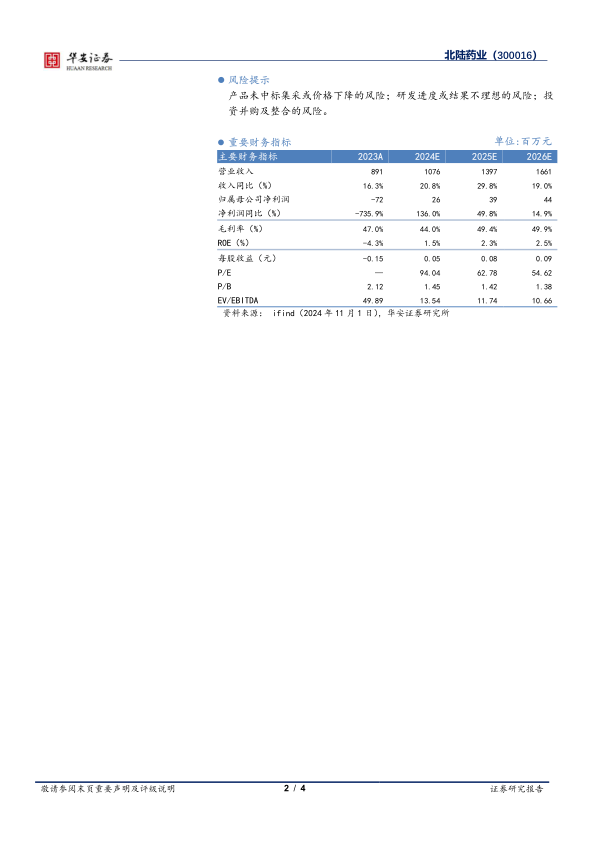 华安证券维持对北陆药业的“增持”评级。预计2024-2026年公司收入分别为10.76亿元、13.97亿元和16.61亿元,同比增长20.8%、29.8%和19.0%。同期归母净利润预计分别为26百万元、39百万元和44百万元,同比增长136.0%、49.8%和14.9%。对应的2024-2026年EPS预计分别为0.05元、0.08元和0.09元,P/E分别为94倍、63倍和55倍。分析师看好公司作为国内对比剂领头企业,通过“外延并购+自主研发”策略开辟第二增长曲线的未来发展。
