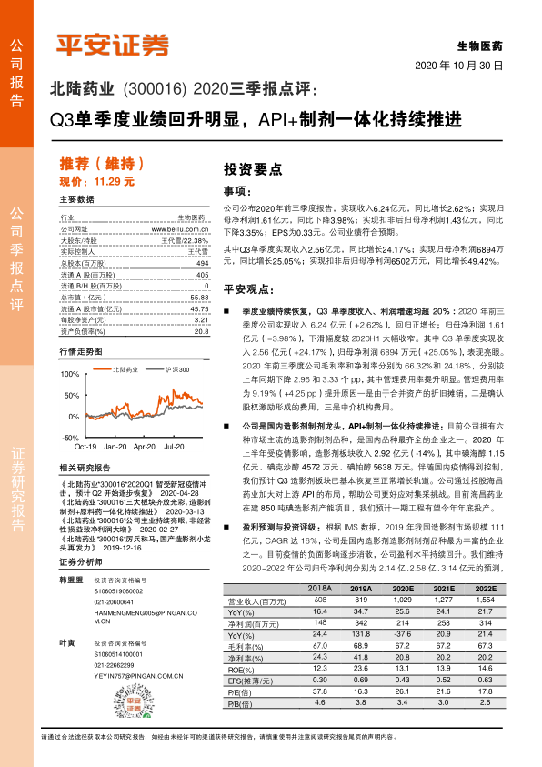 北陆药业Q3单季度业绩回升明显,显示出良好的增长势头。公司作为国内造影剂制剂龙头,通过API+制剂一体化战略,有望进一步巩固市场地位。维持“推荐”评级,但需关注产品放量、产能释放以及疫情影响等风险因素。