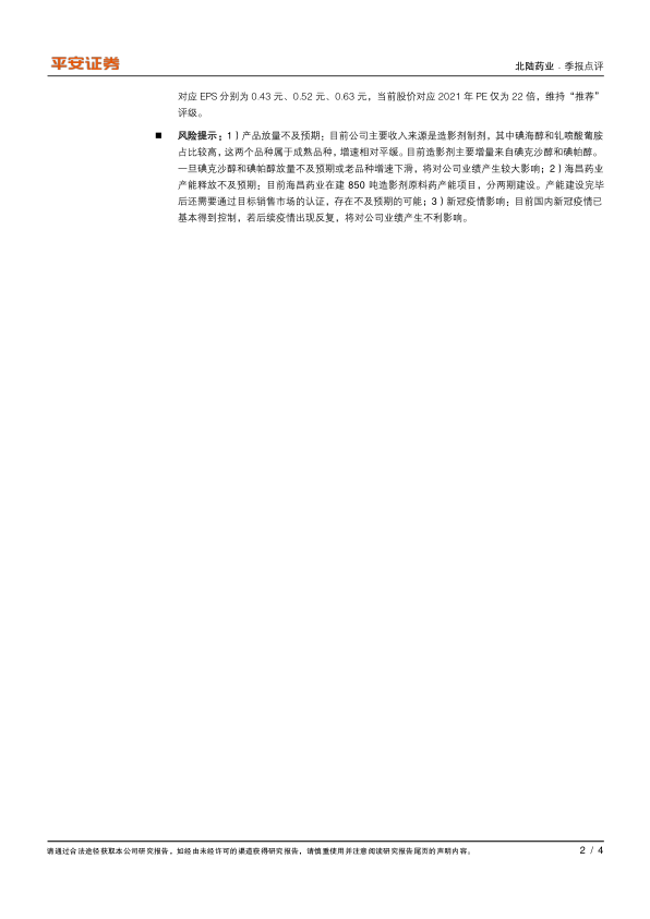 风险提示: 1)产品放量不及预期:目前公司主要收入来源是造影剂制剂,其中碘海醇和钆喷酸葡胺占比较高,这两个品种属于成熟品种,增速相对平缓。目前造影剂主要增量来自碘克沙醇和碘帕醇。一旦碘克沙醇和碘帕醇放量不及预期或老品种增速下滑,将对公司业绩产生较大影响; 2)海昌药业产能释放不及预期:目前海昌药业在建 850 吨造影剂原料药产能项目,分两期建设。产能建设完毕后还需要通过目标销售市场的认证,存在不及预期的可能; 3)新冠疫情影响:目前国内新冠疫情已基本得到控制,若后续疫情出现反复,将对公司业绩产生不利影响。