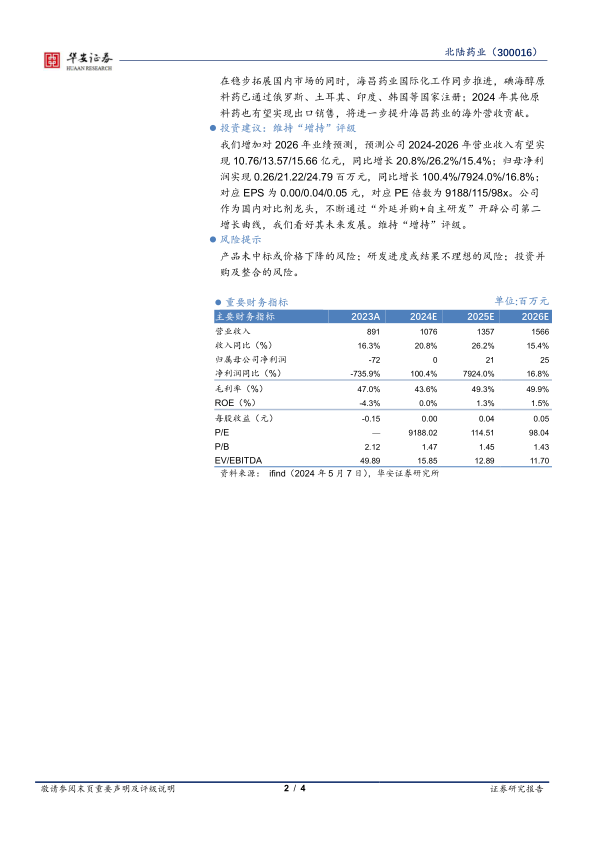 我们增加对2026年业绩预测,预测公司2024-2026年营业收入有望实现10.76/13.57/15.66亿元,同比增长20.8%/26.2%/15.4%;归母净利润实现0.26/21.22/24.79百万元,同比增长100.4%/7924.0%/16.8%;对应EPS为0.00/0.04/0.05元,对应PE倍数为9188/115/98x。公司作为国内对比剂龙头,不断通过“外延并购+自主研发”开辟公司第二增长曲线,我们看好其未来发展。维持“增持”评级。