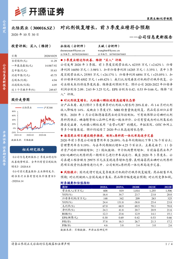 分产品来看,我们预计3季度单季对比剂收入增长约20%左右,而1-6月对比剂收入降幅为14%,反映出3季度CT、MRI检查量快速恢复,药品需求回归正常增长。2020年1月公司取得海昌药业的实际控制权,可有效保障公司碘对比剂原料药供应,碘海醇等核心品种已申报一致性评价,公司有望成为对比剂集采的潜在受益者。九味镇心颗粒采用“自营+代理”的模式,开拓医院、OTC和网上等多个销售渠道,预计仍延续了2020年以来高速增长态势。