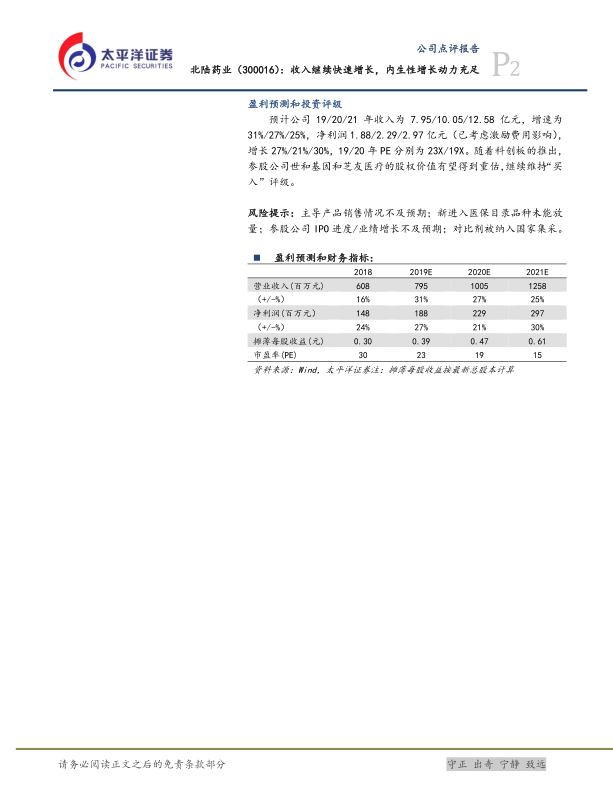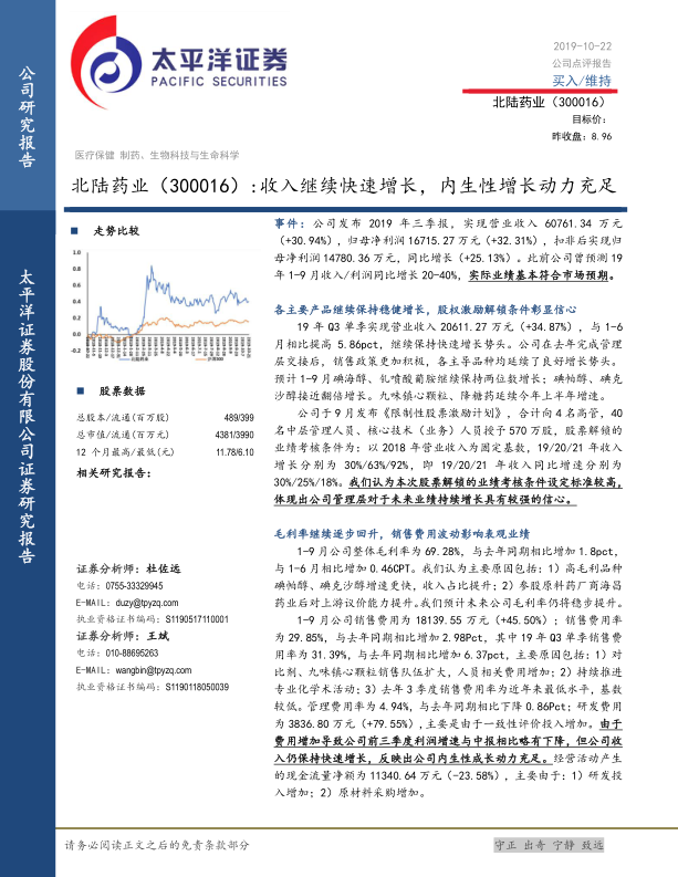 # 中心思想 * **业绩稳健增长与未来信心** * 北陆药业三季报显示收入和利润均实现稳健增长,符合市场预期。股权激励计划的业绩考核目标较高,体现了管理层对公司未来持续增长的信心。 * **毛利率提升与费用控制** * 公司毛利率持续回升,主要得益于高毛利产品占比提升和上游议价能力增强。销售费用增加导致利润增速略有下降,但收入快速增长反映出公司内生性成长动力充足。 # 主要内容 * **事件:公司发布2019年三季报** * 北陆药业发布2019年三季报,营业收入6.08亿元,同比增长30.94%;归母净利润1.67亿元,同比增长32.31%;扣非后归母净利润1.48亿元,同比增长25.13%。业绩基本符合市场预期。 * **各主要产品继续保持稳健增长,股权激励解锁条件彰显信心** * Q3单季收入同比增长34.87%,增速较上半年提高。各主导品种延续良好增长势头,碘海醇、钆喷酸葡胺预计保持两位数增长,碘帕醇、碘克沙醇接近翻倍增长,九味镇心颗粒、降糖药延续上半年增速。 * 公司发布限制性股票激励计划,对高管及核心人员授予股票,解锁的业绩考核条件为19/20/21年收入同比增速分别为30%/25%/18%。该标准较高,体现管理层对未来业绩增长的信心。 * **毛利率继续逐步回升,销售费用波动影响表观业绩** * 1-9月公司整体毛利率为69.28%,同比增加1.8pct,环比增加0.46pct,主要原因包括高毛利品种占比提升和上游议价能力增强。预计未来公司毛利率仍将稳步提升。 * 1-9月销售费用同比增长45.50%,销售费用率增加2.98pct,Q3单季销售费用率增加6.37pct,主要原因是销售队伍扩大、学术活动推进以及去年同期基数较低。研发费用增加79.55%,主要由于一致性评价投入增加。 * **盈利预测和投资评级** * 预计公司19/20/21年收入为7.95/10.05/12.58亿元,增速为31%/27%/25%,净利润1.88/2.29/2.97亿元,增长27%/21%/30%,19/20年PE分别为23X/19X。维持“买入”评级。 * **风险提示** * 主导产品销售情况不及预期;新进入医保目录品种未能放量;参股公司IPO进度/业绩增长不及预期;对比剂被纳入国家集采。 # 总结 * **业绩稳健,未来可期** * 北陆药业发布的三季报显示,公司收入和利润均保持快速增长,业绩符合预期。各主要产品线表现稳健,股权激励计划彰显了管理层对公司未来发展的信心。 * **关注毛利率与费用控制** * 公司毛利率持续提升,但销售费用增加对利润增速产生一定影响。未来需关注公司在保持收入增长的同时,如何有效控制费用,提升盈利能力。