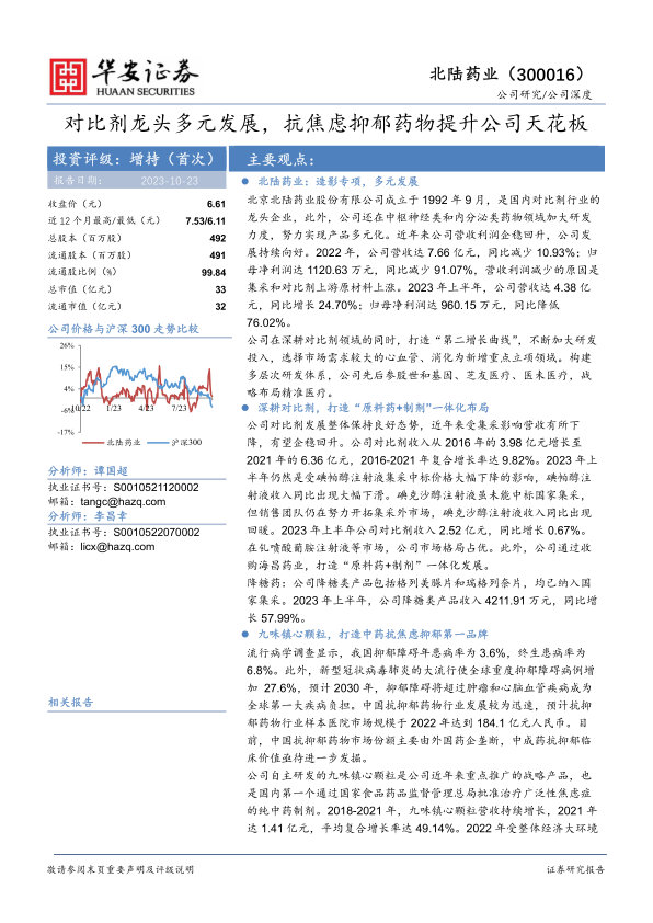 考虑到公司在对比剂领域的稳固地位、多元化发展战略的逐步落地以及九味镇心颗粒的巨大市场潜力,我们首次覆盖北陆药业,并给予“增持”评级。