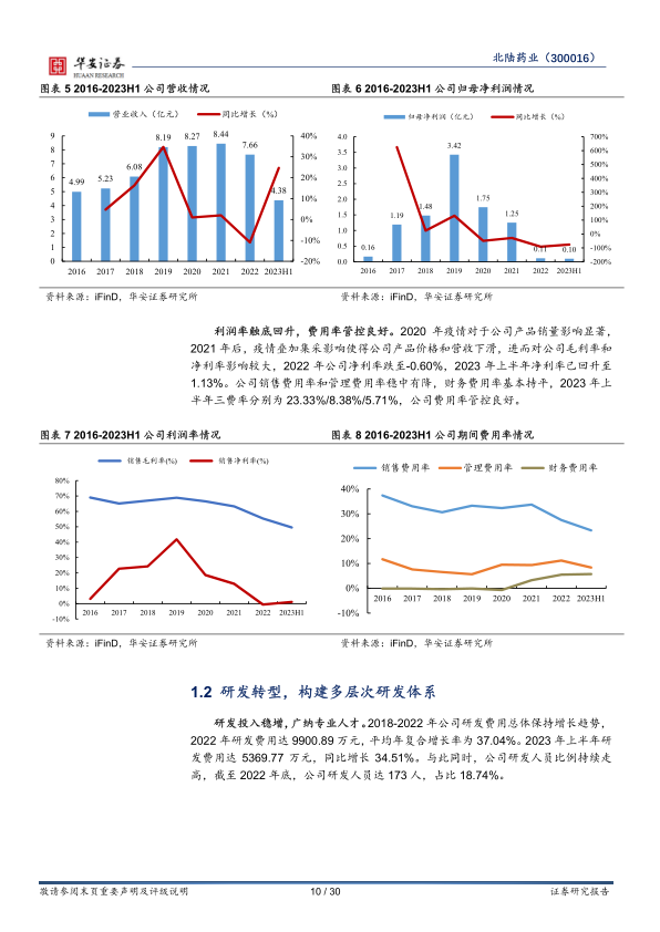 北陆药业持续加大研发投入,并广纳专业人才。2018-2022年,公司研发费用总体保持增长趋势,2022年达9900.89万元,平均年复合增长率为37.04%。2023年上半年研发费用达5369.77万元,同比增长34.51%。截至2022年底,公司研发人员达173人,占比18.74%。