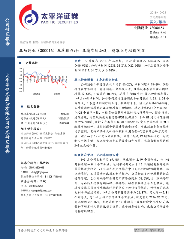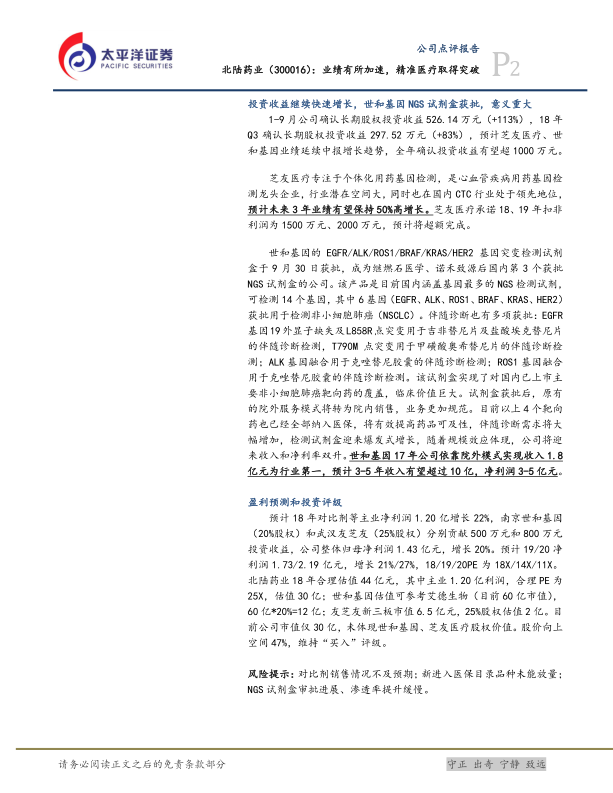 北陆药业2018年第三季度业绩表现强劲,收入和利润均实现加速增长,核心对比剂业务持续放量,并通过优化供应链管理提升了毛利率。公司在精准医疗领域的战略布局取得突破性进展,参股公司世和基因的NGS试剂盒获批,极大地拓展了其在伴随诊断市场的空间,预计将带来显著的投资收益和业绩增长。尽管公司基本面良好且精准医疗业务前景广阔,但当前市值未能充分反映其内在价值,存在明显的估值重估潜力。基于对主业稳健增长和精准医疗业务爆发的预期,报告维持“买入”评级,并提示相关风险。