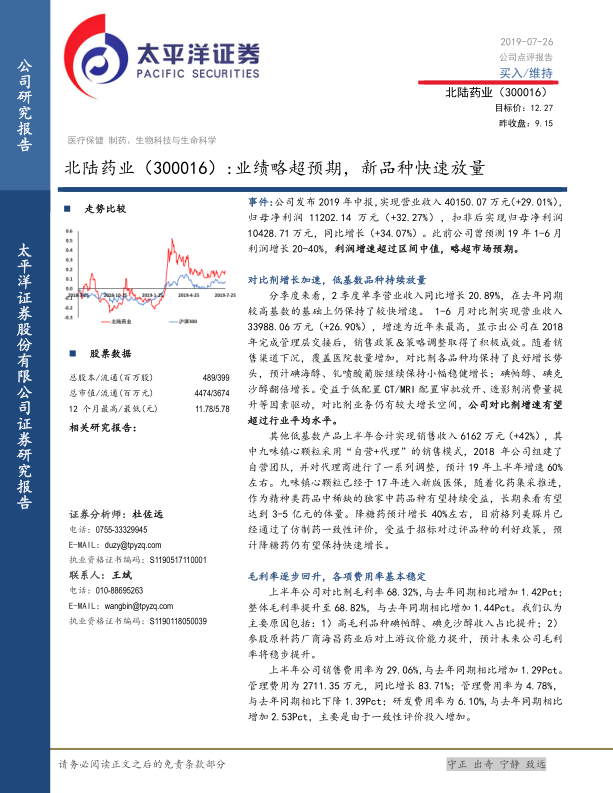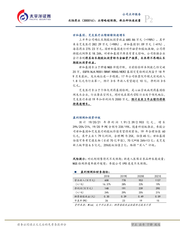 北陆药业2019年上半年表现出色,核心业务对比剂在管理层调整和销售策略优化下实现加速增长,低基数新品种如九味镇心颗粒和降糖药也贡献了显著增量。公司盈利能力持续改善,毛利率稳步提升。此外,对世和基因和芝友医疗等高成长性参股公司的战略投资,有望在未来带来可观的投资收益和股权价值重估。综合来看,公司主业发展势头良好,参股公司具备高成长潜力,太平洋证券维持“买入”评级。