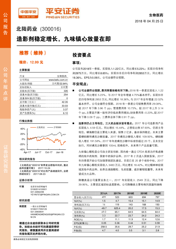 本报告分析了北陆药业2018年一季度的业绩表现,认为公司业绩符合预期,费用率略有下降。报告重点分析了公司造影剂、九味镇心颗粒和降糖类三大药品板块的业务进展,并对公司在精准医疗领域的布局表示看好。考虑到九味镇心颗粒放量较快以及碘帕醇和碘克沙醇中标情况良好,上调了公司未来盈利预测,维持“推荐”评级。同时,报告也提示了药品价格下降、研发风险和股权投资风险。