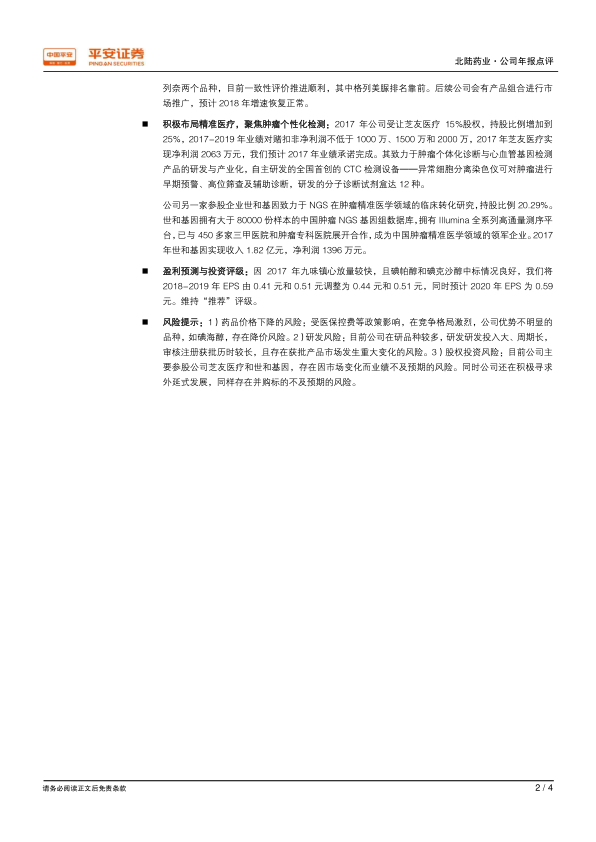 报告提示了药品价格下降、研发风险和股权投资风险。
