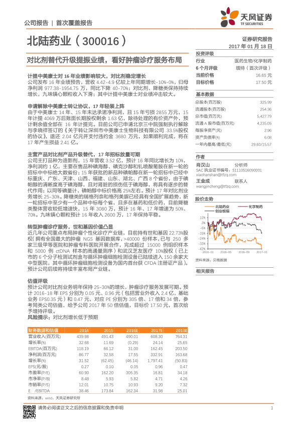 本报告核心观点是看好北陆药业在对比剂领域的升级替代以及在肿瘤诊疗服务方面的布局。报告认为,虽然2016年业绩受到中美康士计提的影响,但对比剂业务的稳定增长和降糖类药物的快速发展为公司提供了增长动力。