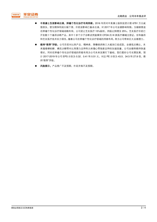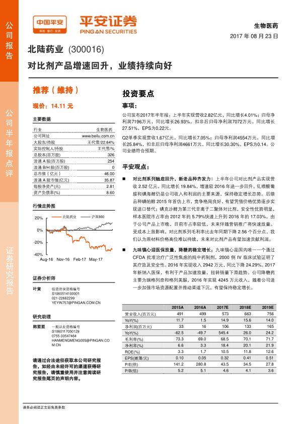 北陆药业2017年上半年业绩表现良好,对比剂产品增速回升,精神类和降糖类药物稳定增长,肿瘤个性化诊疗领域的布局也为未来发展奠定了基础。平安证券维持对公司“推荐”评级,预计未来业绩将维持快速增长。