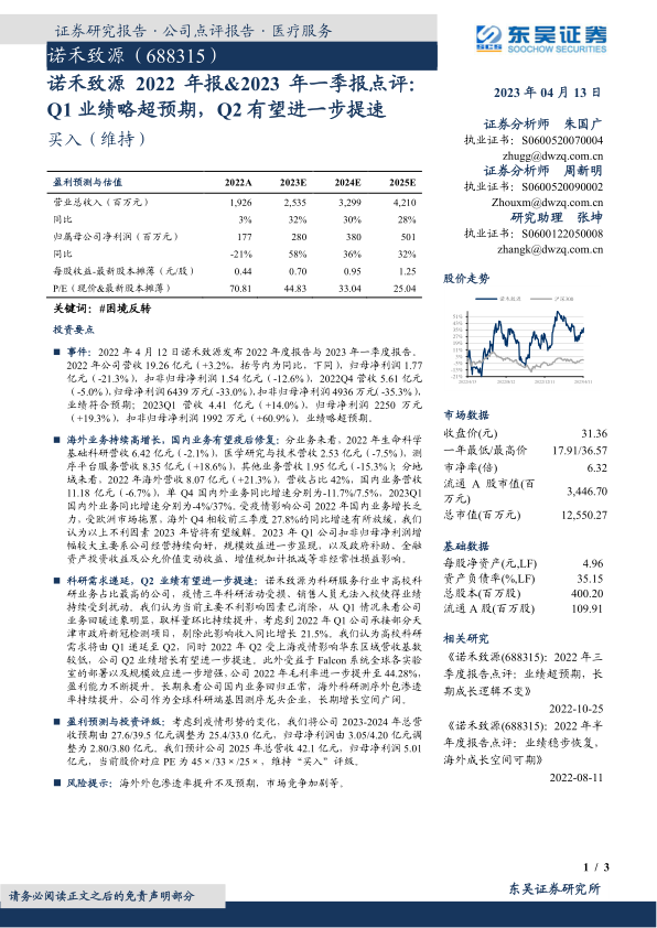 本报告分析了诺禾致源2022年年报和2023年一季报,指出公司Q1业绩略超预期,并预测Q2业绩有望进一步提速。报告强调了海外业务的高增长以及国内业务在疫情后的修复潜力,认为科研需求的递延将推动公司业绩增长。