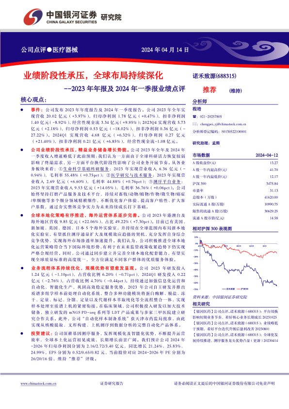 投资建议:公司深耕基因测序服务,发挥规模化及智能化优势,不断提升运营效率,全球本土化运营初见成效,长期增长前景广阔。我们预计公司2024年-2026年归母净利润分别为2.16/2.72/3.40亿元,同比增长21.24%、25.83%、24.99%,EPS分别为0.52/0.65/0.82元,当前股价对应2024-2026年PE分别为26/20/16倍,维持“推荐”评级。