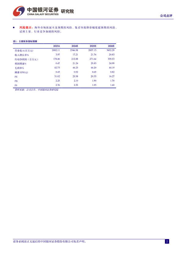 风险提示:海外市场拓展不及预期的风险、集采导致降价幅度超预期的风险、试剂上量、行业竞争加剧的风险。