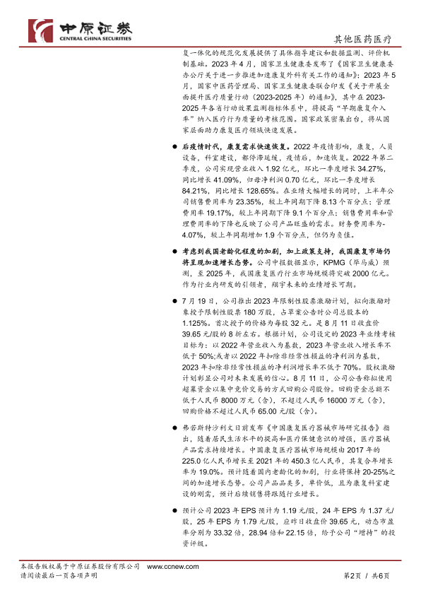 本报告对翔宇医疗的中报进行了全面分析,认为公司受益于康复医疗行业良好的发展前景和政策支持,业绩增长迅速。公司推出的激励计划和股份回购计划也显示了对未来发展的信心。 报告预测了公司未来的盈利能力,并给出了“增持”的投资评级,同时也提示了相关风险。
