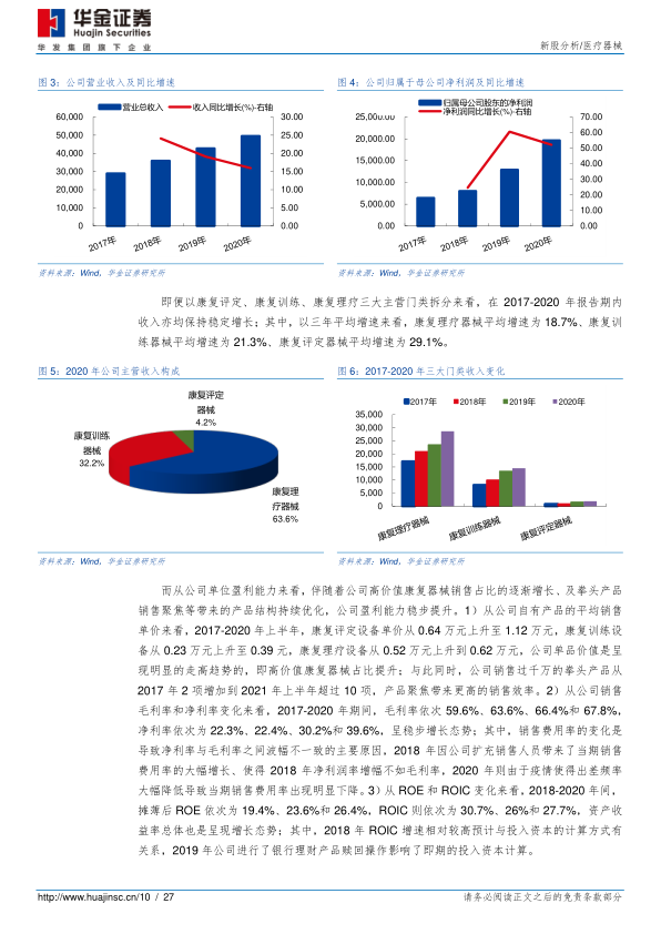 公司是国内康复器械行业领军企业。公司深耕康复医疗器械领域约 20 年,始终致力于疼痛康复、神经康复、骨科康复、产后康复、医养结合等领域智能康复设备的自主研发、生产与销售。1)产品线齐全,业务模式已经成功实现多次跨越。公司是国内少数具有全系列康复医疗器械研发生产能力的企业之一, 已经形成覆盖康复评定、康复训练、康复理疗三大门类、共 400 多种产品的丰富产品结构;同时,公司业务模式成功实现了从单个设备的研发生产到区域康养一体化服务的跨越式发展。2)重视自主研发,有深厚的技术积累和储备。公司是行业标准的制定者之一,同时,公司与中国人民解放军第 150 中心医院-全军军事训练医学研究所、中国残疾人辅助器具中心等著名的医疗康复机构建立了紧密的合作研发关系;2017 年至2020 年上半年,公司研发投入占收入比重依次为 6.02%、 8.03%、 9.71%和 10.6%,研发投入力度呈稳步增长;截至最新,公司研发人员占员工总数比例为 25.55%。