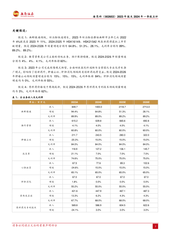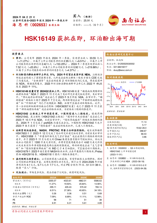 本报告对海思科(002653)2023年年报及2024年一季报进行了深度分析,核心观点如下: