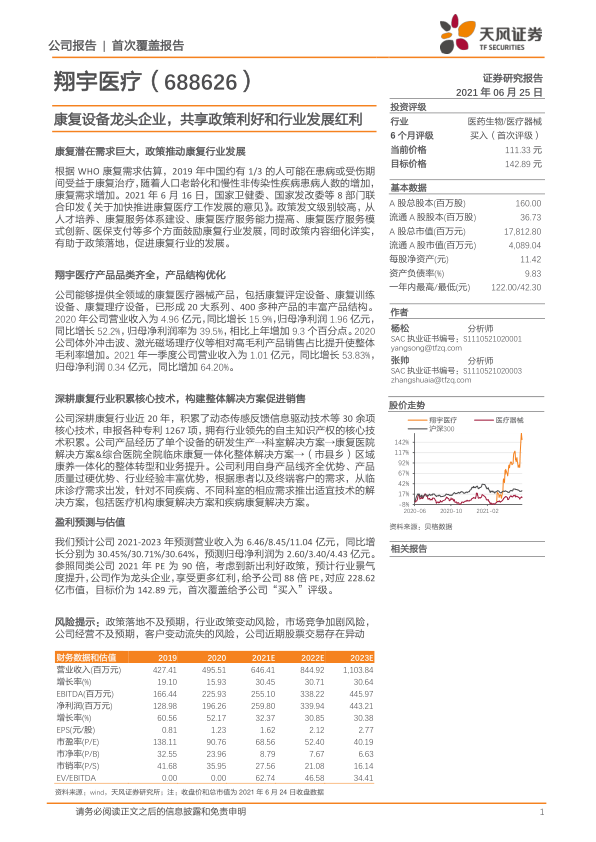 我们预计公司 2021-2023 年预测营业收入为 6.46/8.45/11.04 亿元,同比增长分别为 30.45%/30.71%/30.64%,预测归母净利润为 2.60/3.40/4.43 亿元。参照同类公司 2021 年 PE 为 90 倍,考虑到新出利好政策,预计行业景气度提升,公司作为龙头企业,享受更多红利,给予公司 88 倍 PE,对应 228.62亿市值,目标价为 142.89 元,首次覆盖给予公司“买入”评级。