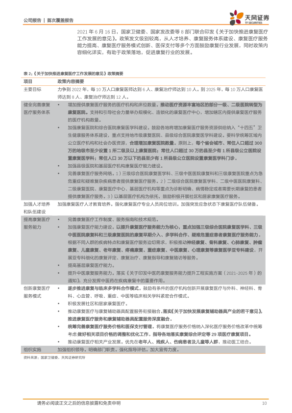 根据 WHO 康复需求估算,2019 年中国约有 1/3 的人可能在患病或受伤期间受益于康复治疗,随着人口老龄化和慢性非传染性疾病患病人数的增加,康复需求增加。2021 年 6 月 16 日,国家卫健委、国家发改委等 8 部门联合印发《关于加快推进康复医疗工作发展的意见》。政策发文级别较高,从人才培养、康复服务体系建设、康复医疗服务能力提高、康复医疗服务模式创新、医保支付等多个方面鼓励康复行业发展,同时政策内容细化详实,有助于政策落地,促进康复行业的发展。