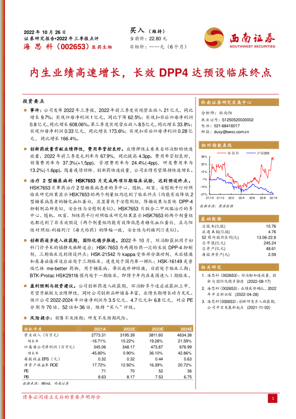 本报告对海思科2022年三季报进行了深入分析,认为公司内生业绩高速增长,主要得益于创新药的快速放量。长效DPP4抑制剂临床试验成功,国际化稳步推进,为公司未来发展奠定了坚实基础。维持“买入”评级,但同时也提示了销售和研发不及预期的风险。