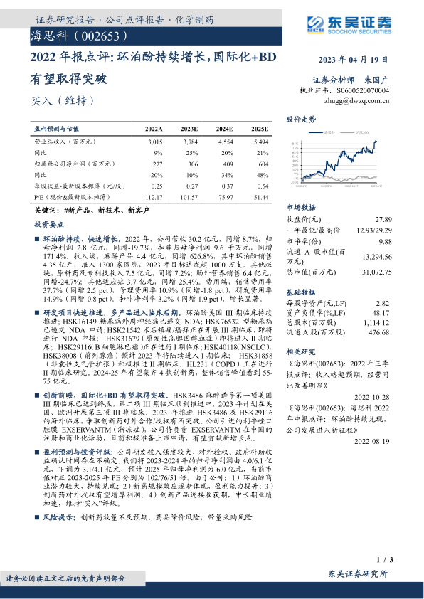 盈利预测与投资评级: 公司研发投入强度较大, 对外授权、政府补助收益确认时间存在不确定, 我们将 2023-2024 年的归母净利润由 4.0/6.1 亿元, 下调为 3.1/4.1 亿元, 预计 2025 年归母净利润为 6.0 亿元, 当前市值对应 2023-2025 年 PE 分别为 102/76/51 倍。 由于公司: 1)环泊酚商业潜力较大,持续兑现; 2) 新药规模效应逐渐体现,盈利能力提升; 3)创新药对外授权有望增厚利润; 4)创新产品迎接收获期,中长期业绩加速, 维持“买入”评级。