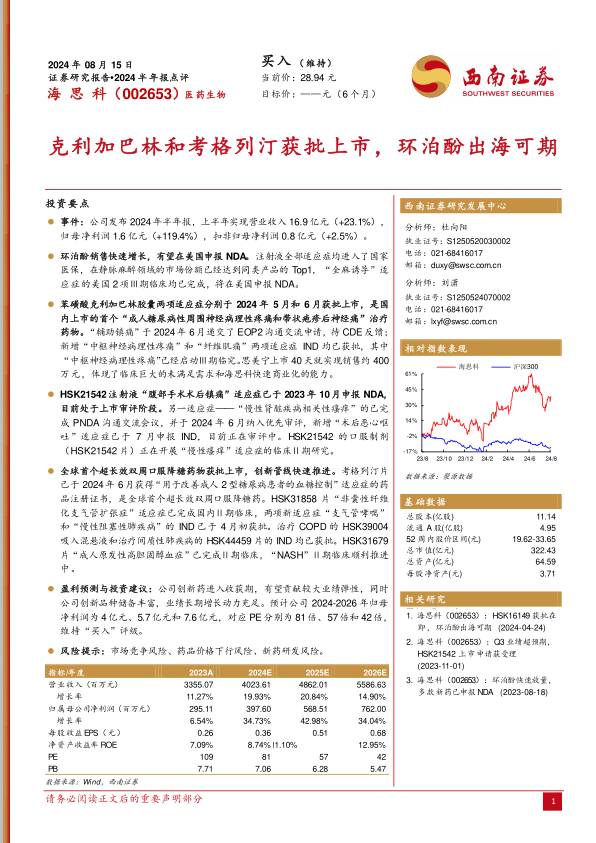 本报告对海思科2024年半年报进行了全面分析,公司业绩增长主要受益于创新药的快速放量。环泊酚、克利加巴林和考格列汀等核心产品市场前景广阔,创新管线持续推进,为公司业绩增长提供充足动力。维持“买入”评级,但需关注市场竞争、药品价格和新药研发等风险。