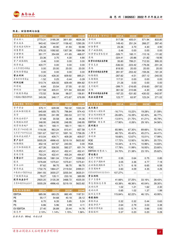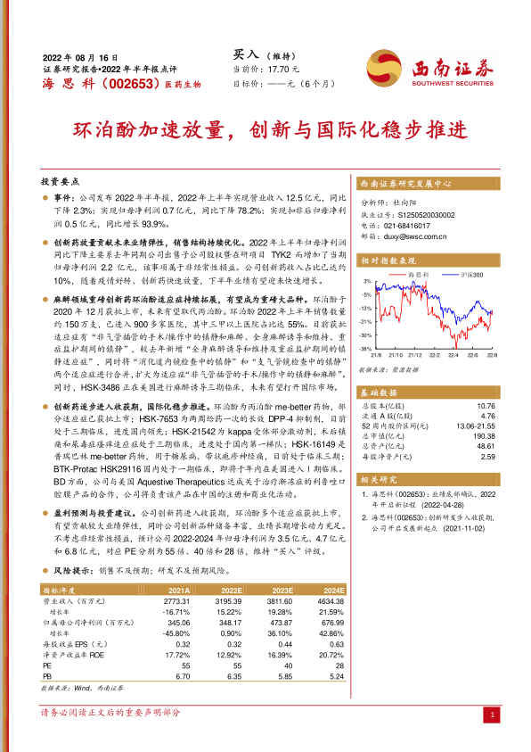 本报告对海思科2022年半年报进行了深入分析,指出公司业绩增长的关键驱动力在于创新药的加速放量和国际化战略的稳步推进。虽然上半年归母净利润同比下降,但扣非后利润大幅增长,显示出公司盈利能力的提升。报告特别强调了环泊酚的市场潜力,并对公司未来几年的盈利进行了预测,维持“买入”评级。同时,报告也提示了销售和研发方面存在的风险。