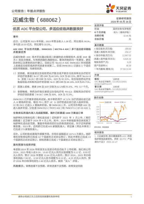 本报告对迈威生物2023年年报进行了深入分析,肯定了公司在ADC技术平台和生物类似药业务方面的优势。9MW2821在多个适应症的临床数据表现亮眼,生物类似药业务稳步推进并积极拓展海外市场。虽然公司目前仍处于亏损状态,但考虑到其技术优势和市场潜力,维持“买入”评级。投资者应关注销售放量、研发进度和政策变动等风险因素。