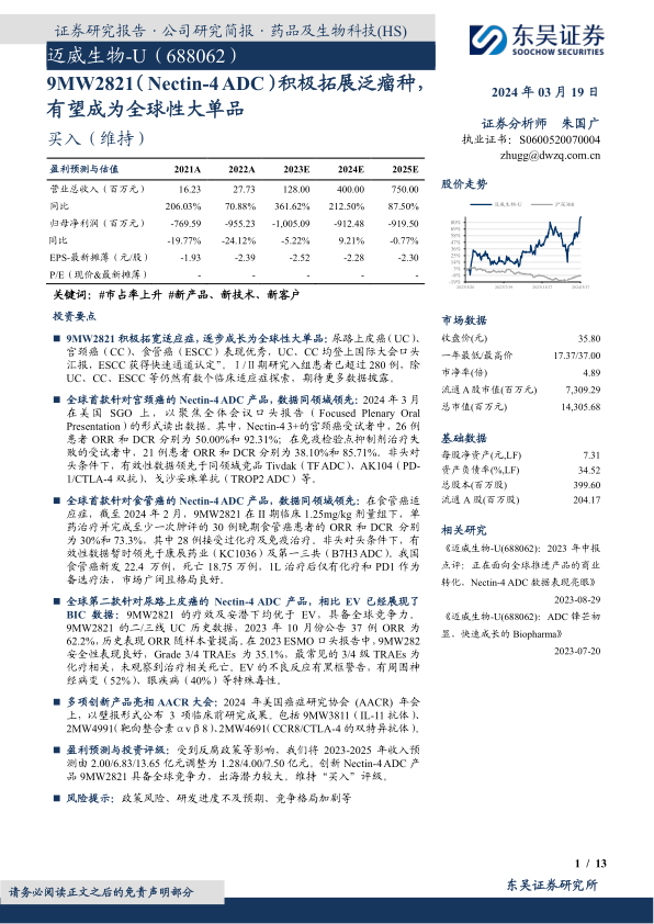 盈利预测与投资评级:受到反腐政策等影响,我们将2023-2025年收入预测由2.00/6.83/13.65亿元调整为1.28/4.00/7.50亿元。创新Nectin-4ADC产品9MW2821具备全球竞争力,出海潜力较大。维持“买入”评级。