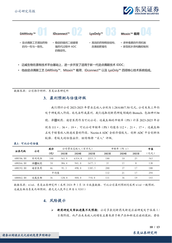 公司不仅拥有明星产品9MW2821,还具备丰富的创新研发管线和自主开发的下一代ADC定点偶联技术平台(IDDC™),为未来的持续增长奠定坚实基础。尽管公司目前仍处于研发投入阶段,短期内尚未实现盈利,但其创新产品的巨大市场前景和全球出海潜力,使得公司享有较高的估值溢价。基于对公司创新能力和产品市场潜力的认可,分析师维持“买入”评级。