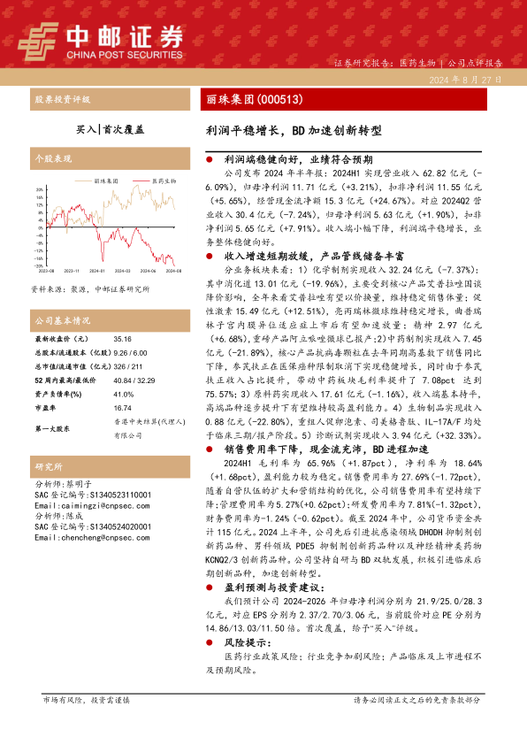 2024H1毛利率为65.96%(+1.87pct),净利率为18.64%(+1.68pct),盈利能力较为稳定。销售费用率为27.69%(-1.72pct)随着自营队伍的扩大和营销结构的优化,公司销售费用率有望持续下降;管理费用率为5.27%(+0.62pct);研发费用率为7.81%(-1.32pct)财务费用率为-1.24%(-0.62pct)。截至2024年中,公司货币资金共计115亿元。2024上半年,公司先后引进抗感染领域DHODH抑制剂创新药品种、男科领域PDE5抑制剂创新药品种以及神经精神类药物KCNQ2/3创新药品种。公司坚持自研与BD双轨发展,积极引进临床后期创新品种,加速创新转型。