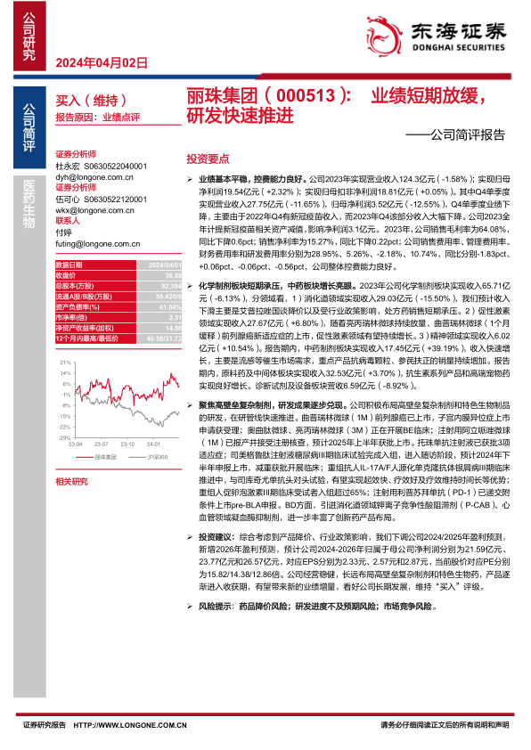 丽珠集团2023年业绩短期受到新冠疫苗收入下降和部分产品降价的影响,但通过有效的费用控制,归母净利润仍实现平稳增长。公司在化学制剂板块面临短期压力,但促性激素和精神领域表现良好,中药板块则实现亮眼增长。展望未来,公司积极布局高壁垒复杂制剂和特色生物药的研发策略正逐步兑现成果,多项创新产品进入关键阶段,有望成为未来业绩增长的核心驱动力。尽管面临药品降价、研发不及预期和市场竞争等风险,但公司稳健的经营和前瞻性的研发投入,使其长期发展潜力值得关注,维持“买入”评级。
