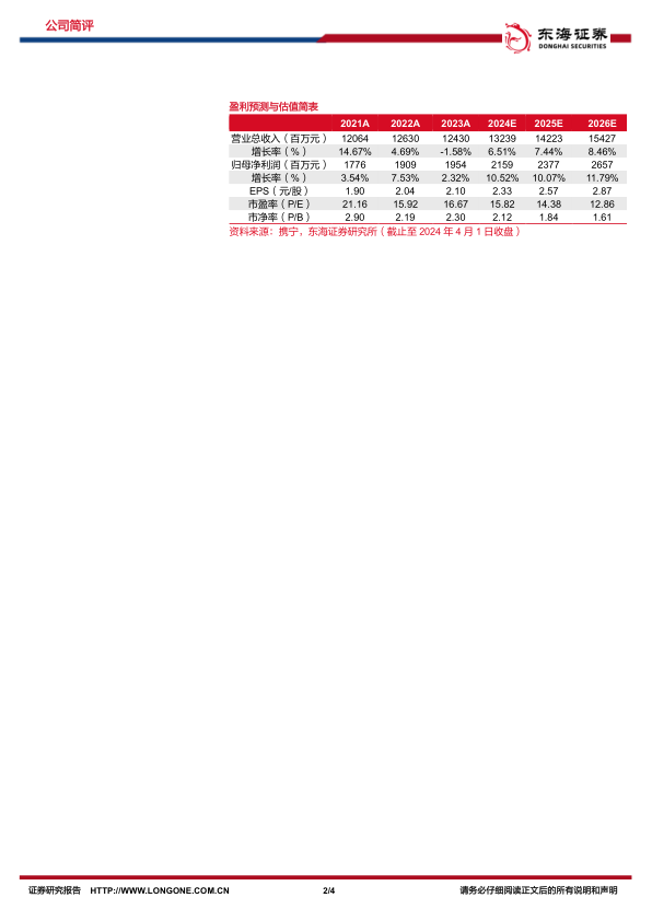 综合考虑产品降价和行业政策影响,东海证券下调公司2024/2025年盈利预测,并新增2026年盈利预测。预计公司2024-2026年归属于母公司净利润分别为21.59亿元、23.77亿元和26.57亿元,对应EPS分别为2.33元、2.57元和2.87元。当前股价对应PE分别为15.82/14.38/12.86倍。
