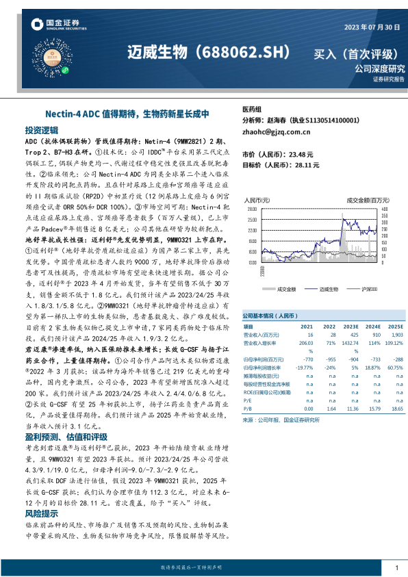 考虑到君迈康®与迈利舒®已获批, 2023 年开始陆续贡献业绩增量,且 9MW0321 有望 2023 年获批。预计 2023/24/25 年公司营收4.3/9.1/19.0 亿元,归母净利润-9.0/-7.3/-2.9 亿元。我们采取 DCF 法进行估值,假设 2023 年 9MW0321 获批, 2025 年长效 G-CSF 获批;我们认为合理市值为 112.3 亿元,对应未来 6-12 个月的目标价 28.11 元。首次覆盖,给予“ 买入”评级。