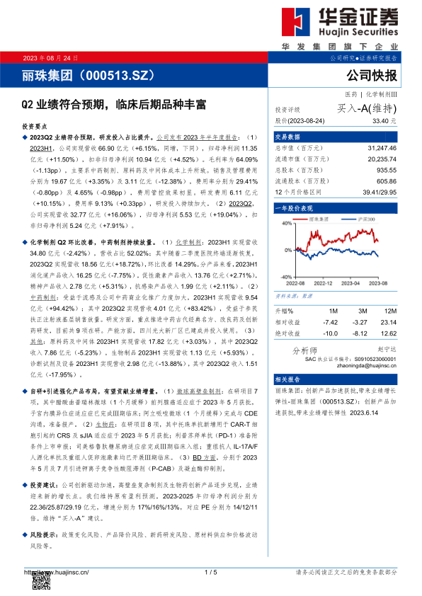 丽珠集团2023年上半年业绩稳健增长,Q2业绩符合预期,研发投入持续加大,化学制剂业务环比改善,中药制剂受益于市场推广和基层销售放量。