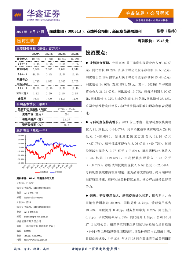 丽珠集团2021年前三季度业绩表现符合预期,营业收入和扣非净利润实现稳健增长,主要得益于专科制剂板块的强劲驱动,特别是消化道、促性激素和精神领域的核心品种持续放量。公司在加大销售和研发投入的同时,其重组新型冠状病毒融合蛋白疫苗(V-01)项目在全球多中心Ⅲ期临床试验中进展顺利,展现出良好的安全性和保护效力,有望成为公司未来的重要增长点。财务预测显示,公司未来几年营收和净利润将持续增长,盈利能力和资产利用效率将进一步提升,财务结构保持健康。综合来看,丽珠集团基本面良好,成长性突出,战略布局清晰,维持“推荐”评级。
