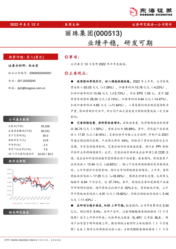 疫情影响常规诊疗,收入增速短期放缓。 2022 年上半年,公司实现营业收入 63.03 亿元(+1.08%),归母净利润 10.18 亿元(-4.23%),扣非归母净利润 10.46 亿元(+13.73%),对应 EPS 1.09 元。其中 Q2单季实现营收 28.24 亿元(-2.15%),归母净利润 4.64 亿元(-14.47%),扣非归母净利润 4.85 亿元(+11.64%)。二季度国内部分地区疫情较为严重,影响常规诊疗水平,对公司产品尤其是处方药的销售造成一定负面影响。