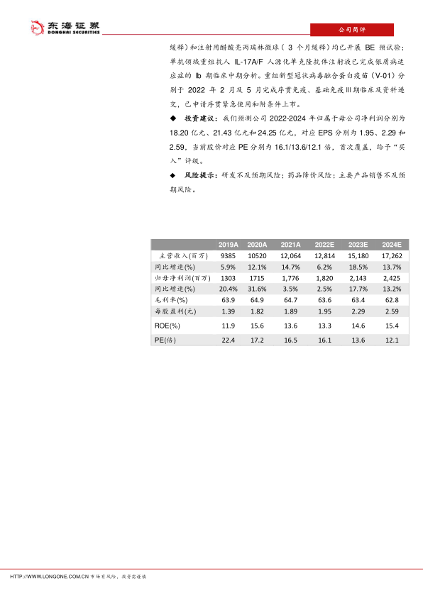 风险提示: 研发不及预期风险; 药品降价风险;主要产品销售不及预期风险。
